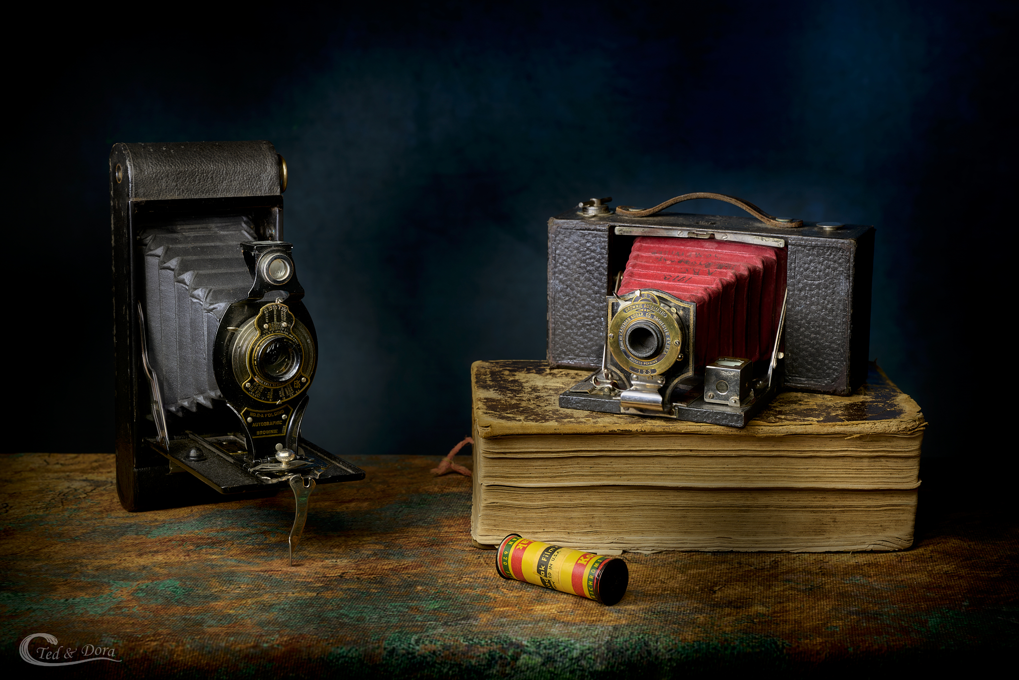 The two cameras pictured are both made by Kodak. They are both in nice shape and functional. The camera on the left is a 2A Folding Autographic Camera. The camera on the right is a No 2 Folding Pocket Brownie Automatic, Model B. We took this photograph in our dining room with a Nikon Z7 II. Lighting was handled by a small LED flashlight.